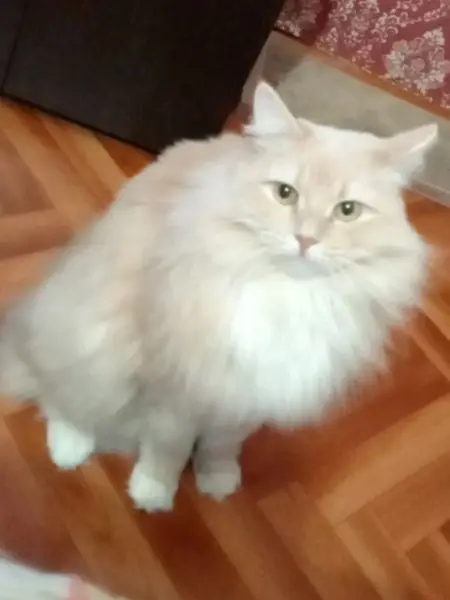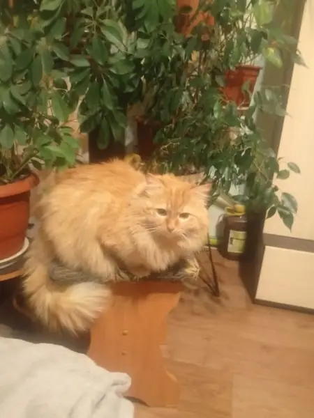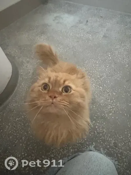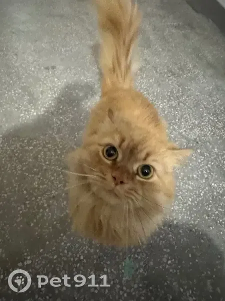 Пушистая кошка или кот, скорее всего кот. Цвет рыжий Особые приметы : справа усы черные, слева белые. Нашли в подъезде на лестнице, как увидел меня, сразу побежал и начал мурчать