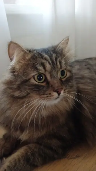 Окрас коричневый, кошечка плакала на дереве возле дома, подзвала к себе она слезла с дерева ( благо оно не высокое ) и она крутилась вокруг меня, но у меня не было возможности ее забрать