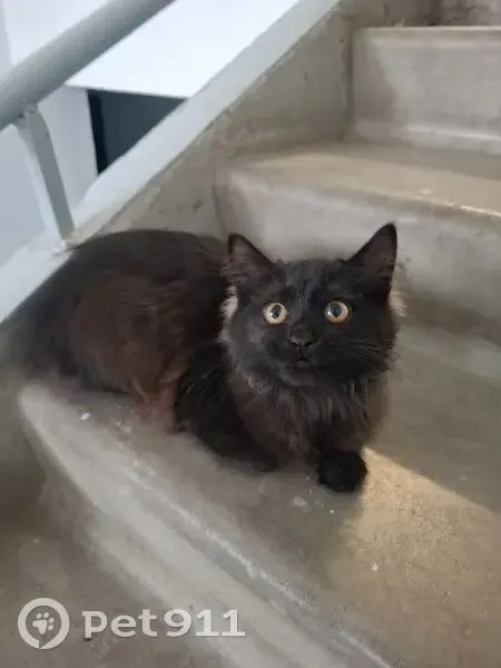 Кот или кошка чёрного цвета, скорее всего породистый, интересный окрас, за ушами пушистые бежевые оборки, большие глаза, вероятнее всего с оранжевым оттенком.