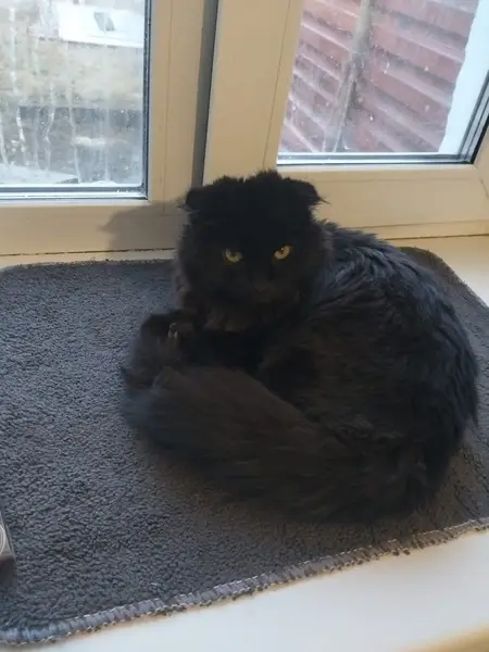 Все на фото. Сидела в подъезде, очень истощена.