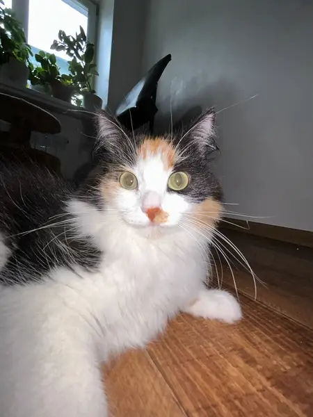 Найдена была у окна дома. Топталась лапами, мурчала и просилась на руки. Была голодной. На вид домашняя.