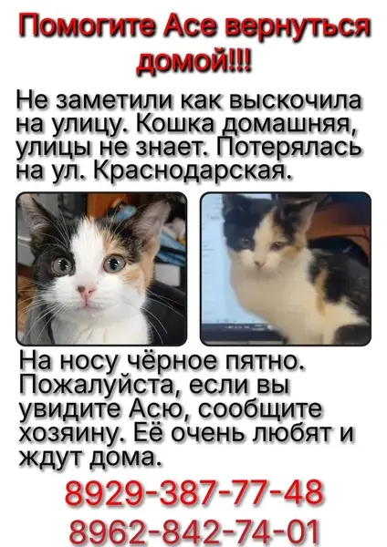 Молодая кошечка трехцветная (бело-рыже-черная) с фиолетовым ошейником от блох. Очень ласковая, ручная, ощущение, что домашняя. Нашла ее вечером в пт. (18.11.22), она плакала на морозе между домами 3 и 3/1 по ул. Связистов. Не пугалась, не убегала, видимо, подошла на голос (мы с соседом разговаривали), сразу пошла на ручки и стала громко урчать. Была довольно чистая, без блох, вроде. У себя долго держать не можем - маленькие дети, я аллергик.