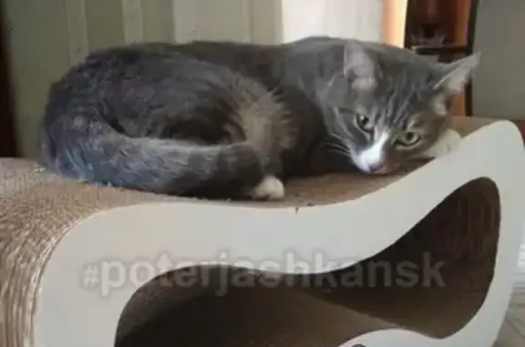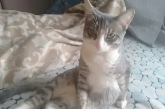 Найдена ласковая молодая кошечка. Окрас сероватый с полосами, белый животик, есть белый галстучек и носочки. На мордочке немного рыжинки. Любит покушать. Лоток знает.