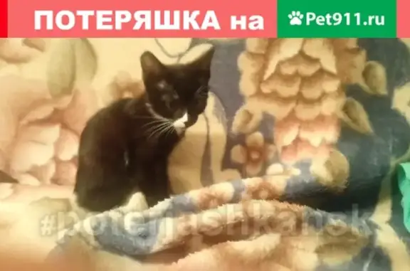 Кошечка, на вид месяца три , черная с белой грудкой и белыми лапками.