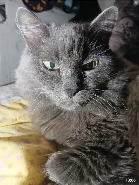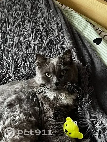нашли котика в 10 вечера напротив дома. Большой пушистый серый кот. Видно, что тело стрижено машинкой. Любит спать у головы на подушке. Очень ласковый и любвеобильный
