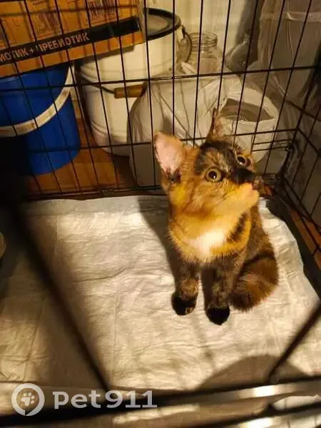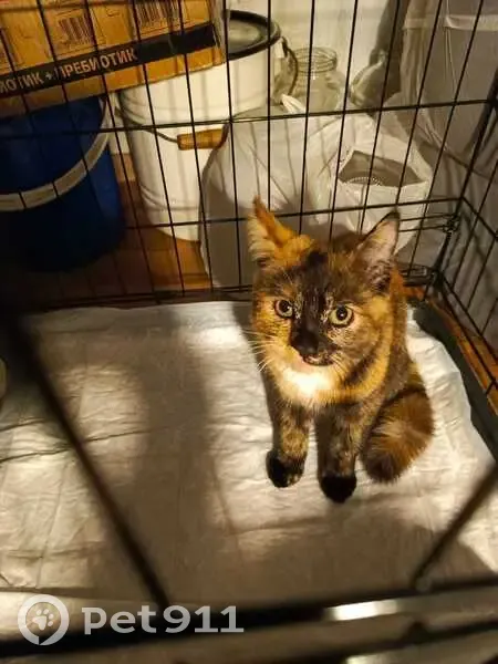 Нашли котёнка подростка, сидела на дереве, плакала, боится собак и других кошек, к людям идёт охотно, видно, что домашняя, ухоженная, не худая, окрас красивый, 3х цветный