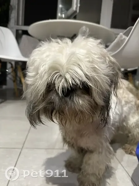Белая собака, вроде пекинес, черная шлейка. Нашли во дворе дома указанного в объявлении. Настойчиво просился в 3 подъезд, думали оттуда. Контактный номер указан