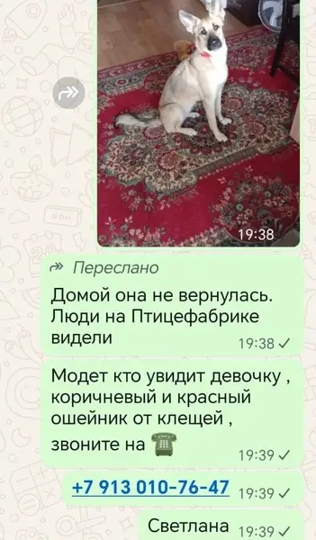 Окрас бело- рыжий, короткошерстная, примерно 2-3 месяца, дружелюбна с людьми, ладит с другими домашними животными. Нашлась собака 31 июля поздно вечером, сидела на мостике одна без ошейника