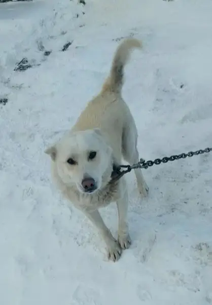Один глаз белый, кажется слепой. Кабель. Вид как у бездомного пса. Стоял возле магазина и просил еды.