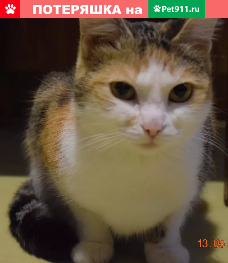 Простая домашняя трёхцветка. 4 года. Первый раз оказалась на даче.Не успела даже зайти в дом.Освободилась из шлейки и под забор за участок.Отзывается на "Мура".Обьявления расклеены, всё её "пахучее" разложено за забором.