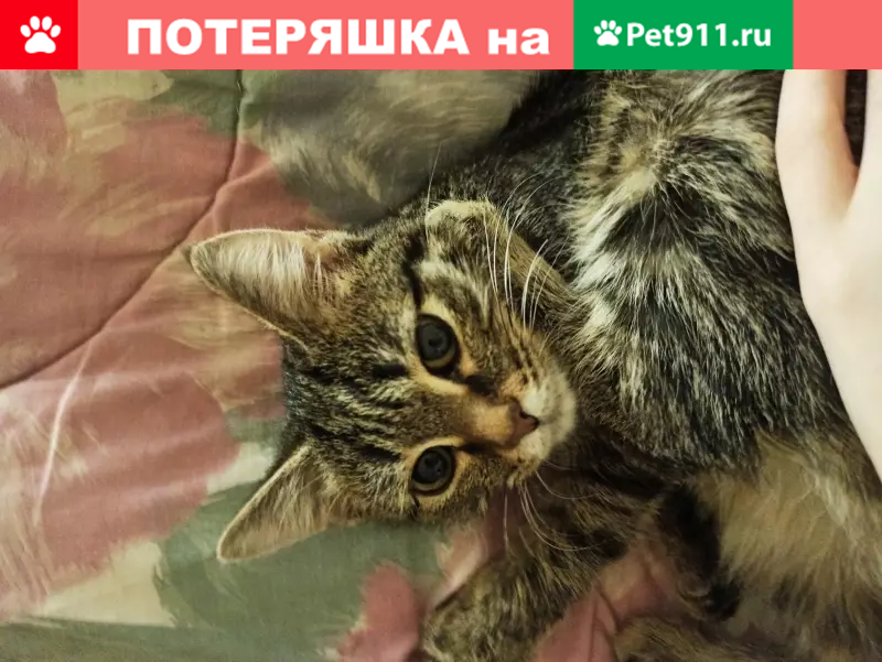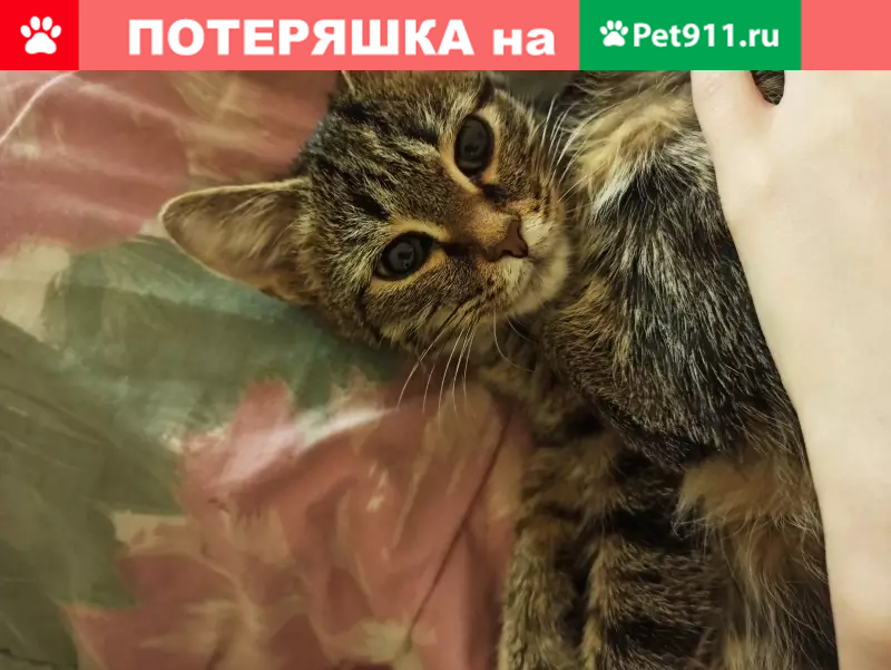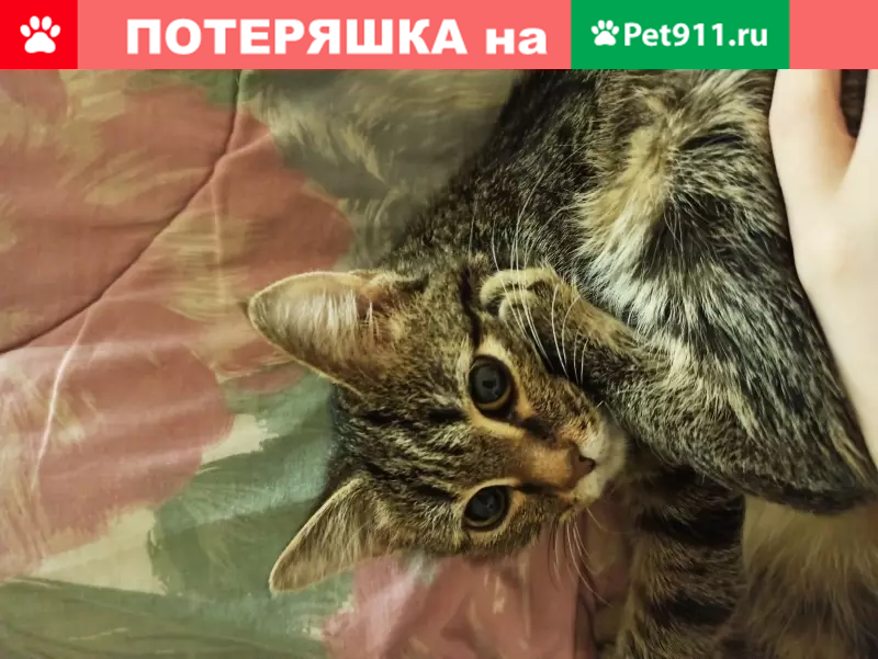 25.04 около дома Адриена Лежена 8/1 сорвался со шлейки котёнок девяти месяцев мужского пола. Котёнок полосатый (черный, коричневый и бежевый цвета), имя - Полосатик.