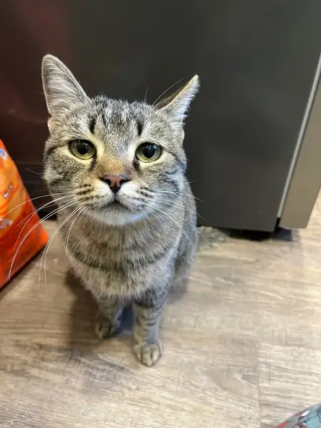 Кот обычный полосатый , Зовут Кузя , было на шее вроде что то ошейника , взяли с собой на прогулку , но коту это не понравилось, и он убежал в густые кусты , искали очень долго безуспешно