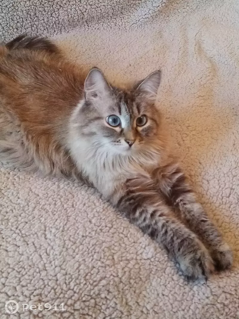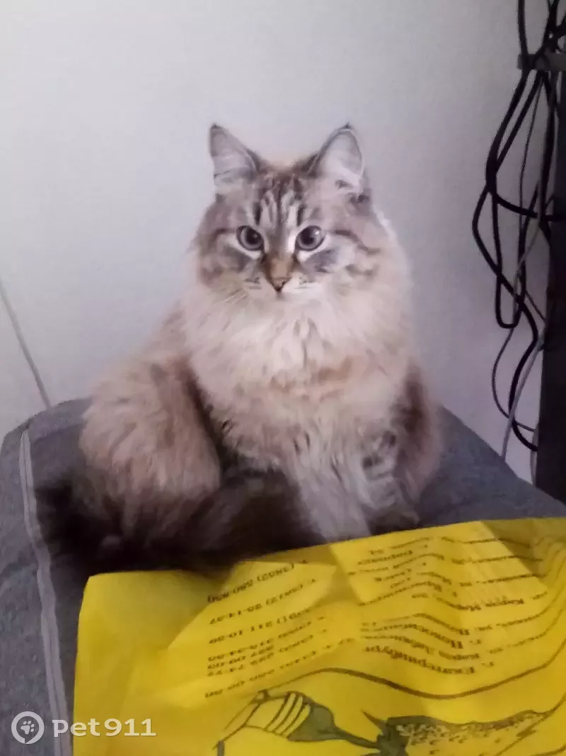 Кошка сибирская, среднего размера. Порода невская маскарадная. Один глаз имеет неровность, с задней стороны головы есть еле заметные полосы. Голубые глаза, на имя не отзывается и к улице не приучена. Пол женский. Точная причина пропажи неизвестно. Либо упала с балкона, либо выбежала в подъезд, но при поиске не нашлась там.