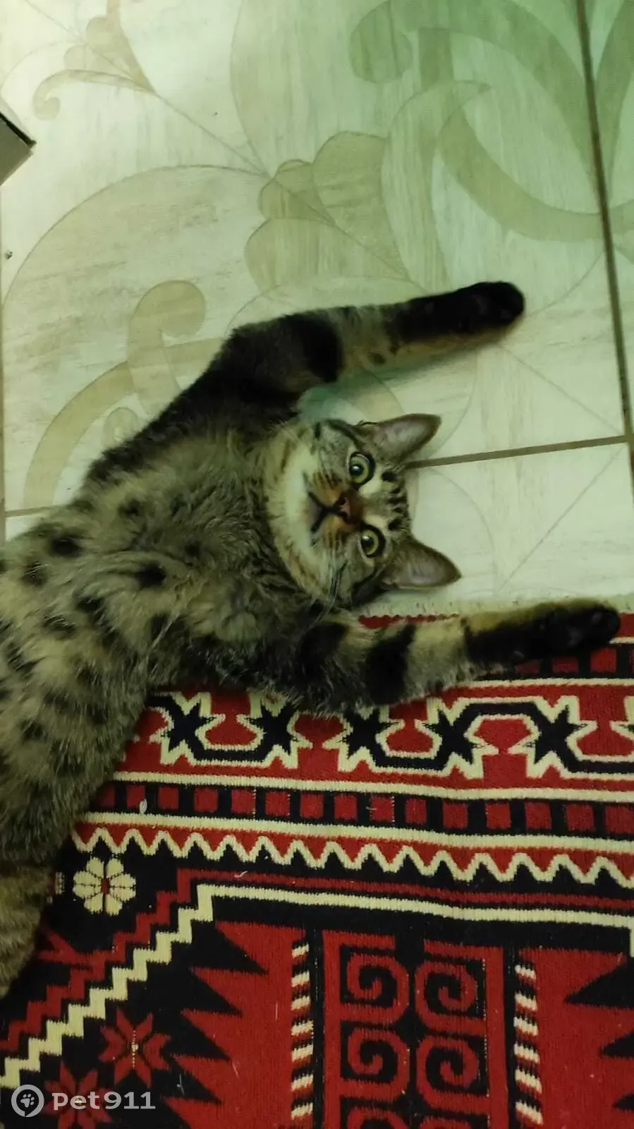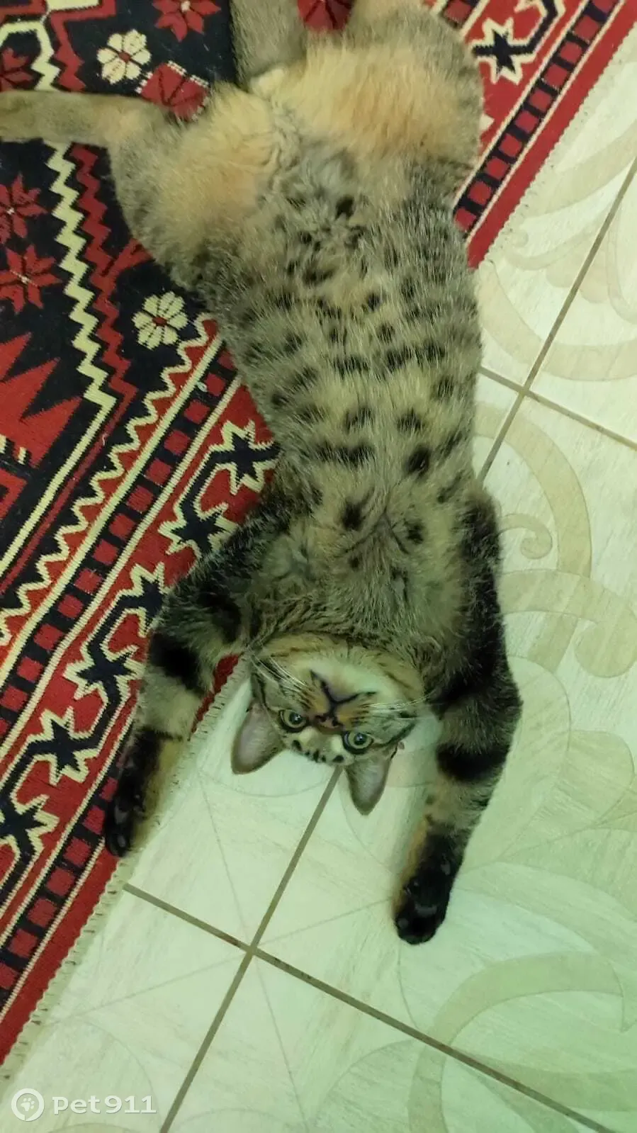 Пропал кот. Возраст 10 месяцев. Окрас: по всему животику и спинке чёрные пятнышки, на хвостике и внешней стороне лапок полоски, на внутренней стороне лапок рыжий опал, шерсть с серебристым отливом ! Есть опознавательная отметка!