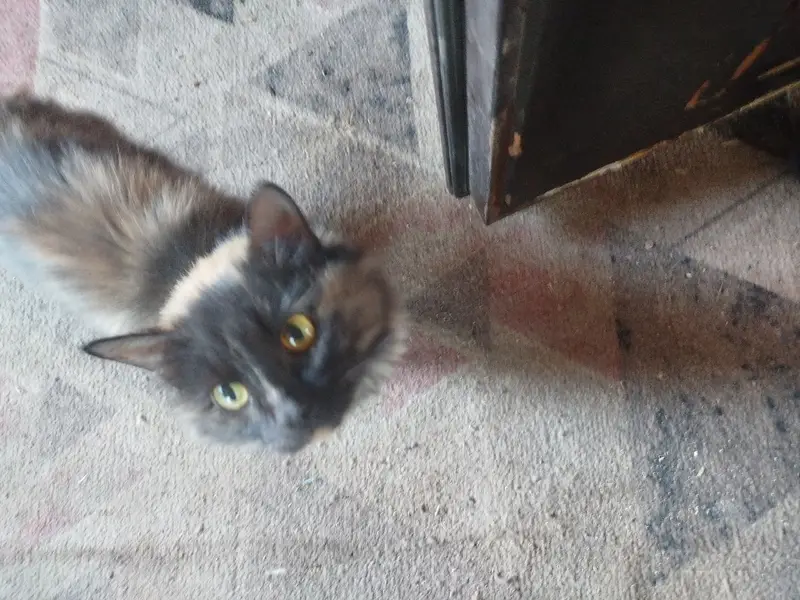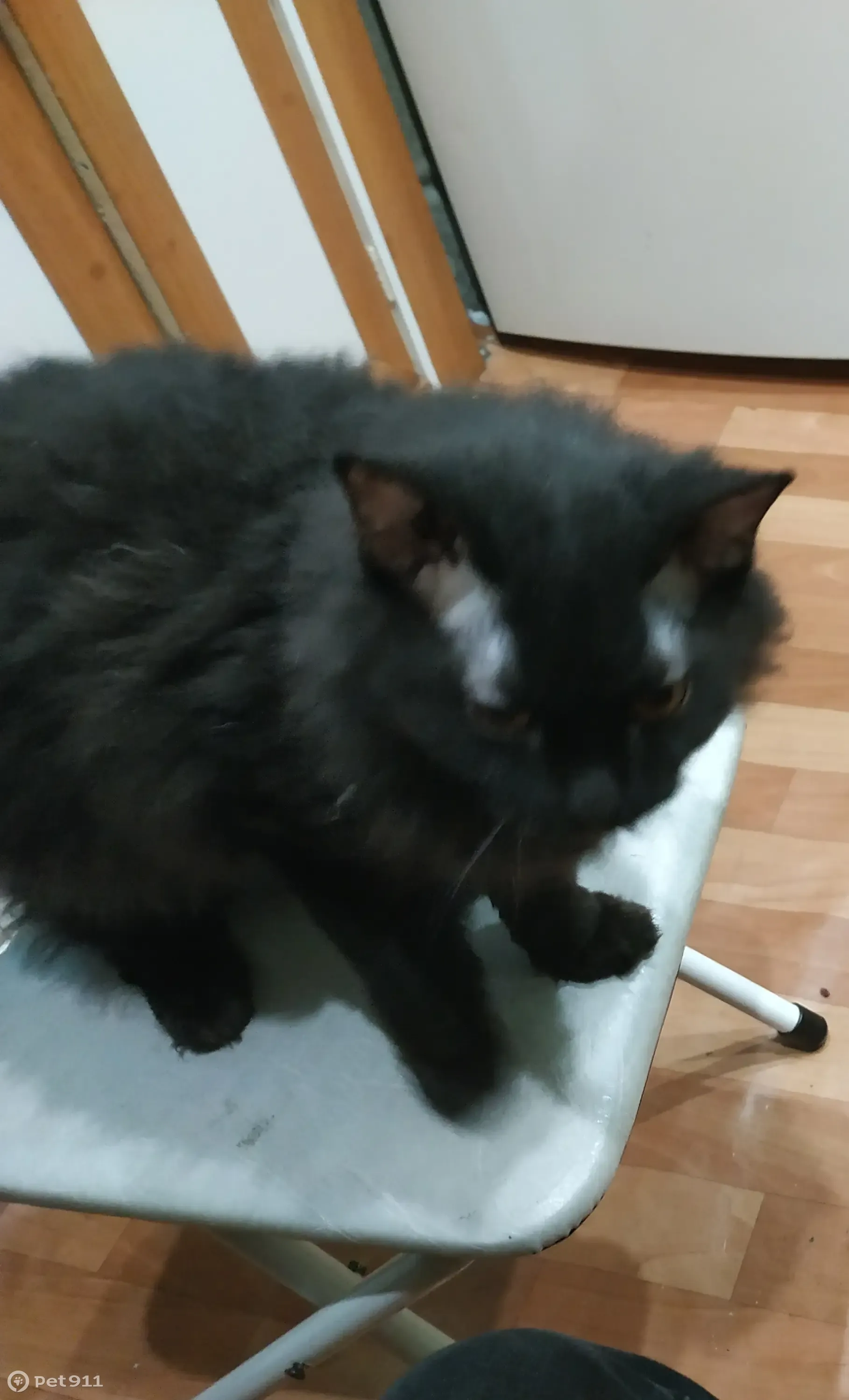 Не умеет мяукать, только очень и тихо через силу, либо просто мявкать с шипением. Нелюдимая. Шерсть редкая, местами проглядывается кожа. От глаз до ушей залысины. Черная, в некоторых частях шерсть сероватая. на подбородке виднеются белые пятнышки. кличка "Лапа".