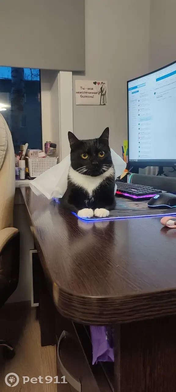 Кошка Буся. Черная, гладкошерстная, белая грудь и носочки. Маленькая голова и большое пузико.