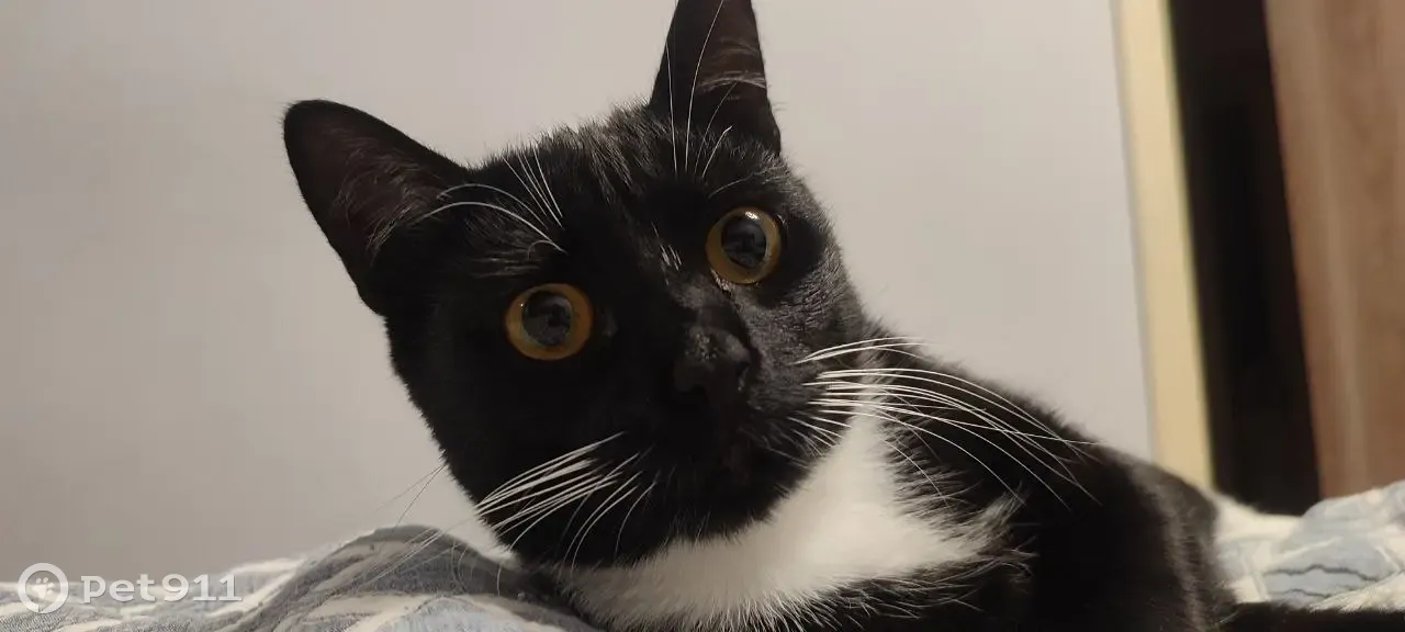 Желтые глаза. На черном носу 3 белых волосины. Мяукает тихо, как мышка.