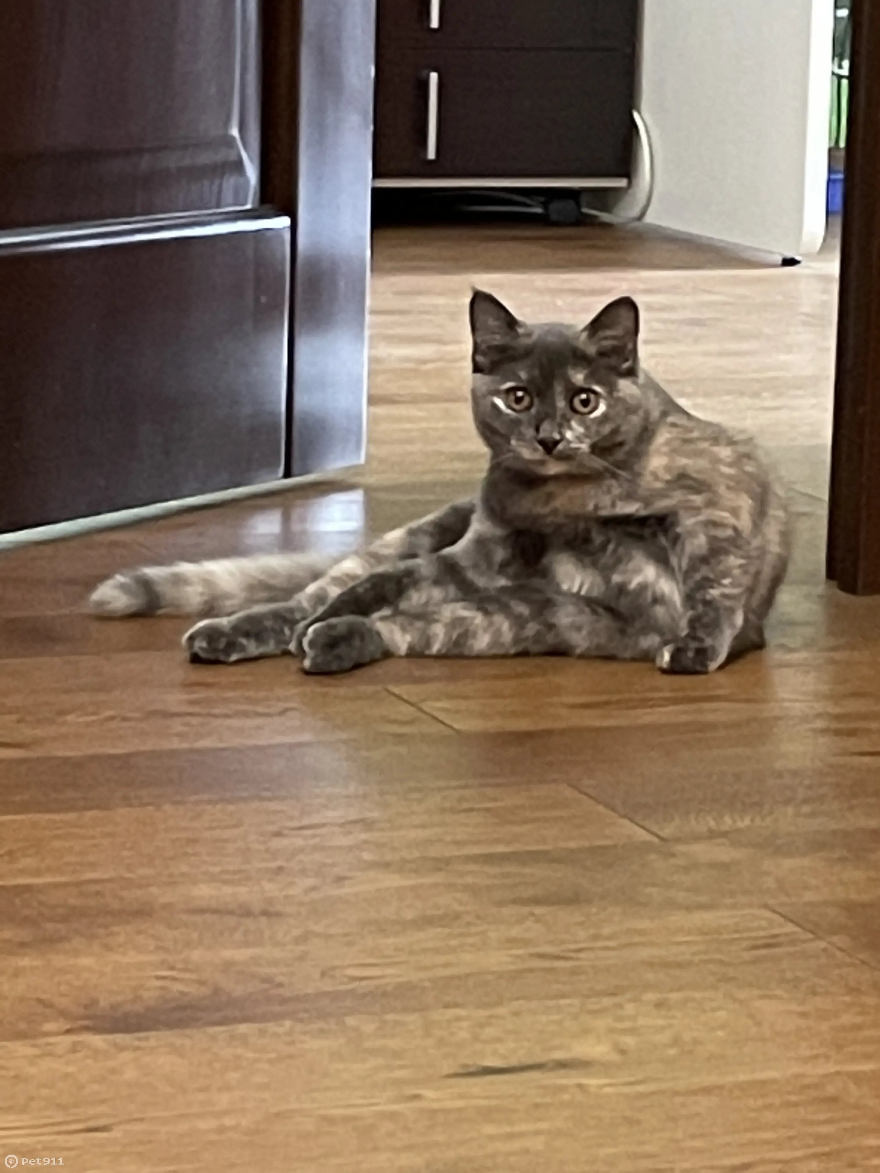 Девочка, серого окраса с рыжими и белыми пятнышками, подбородок и правый ус белые, ушки в мелкую крапинку, серый нос, рыжие глаза. Кошка выпрыгнула с балкона 4-го этажа