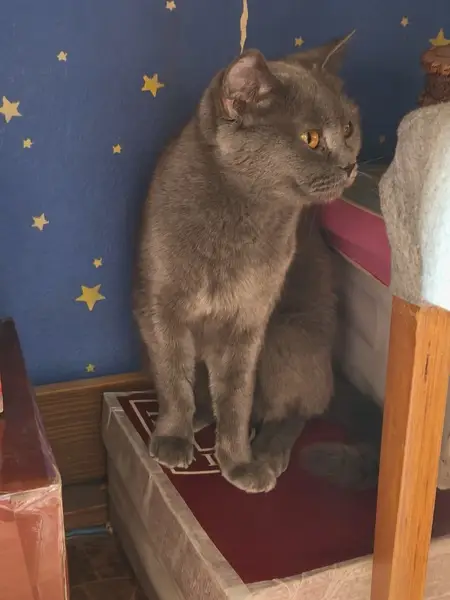 Молодой серый кот с очень богатым и красивым хвостом. Гладкошерстый.