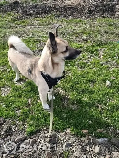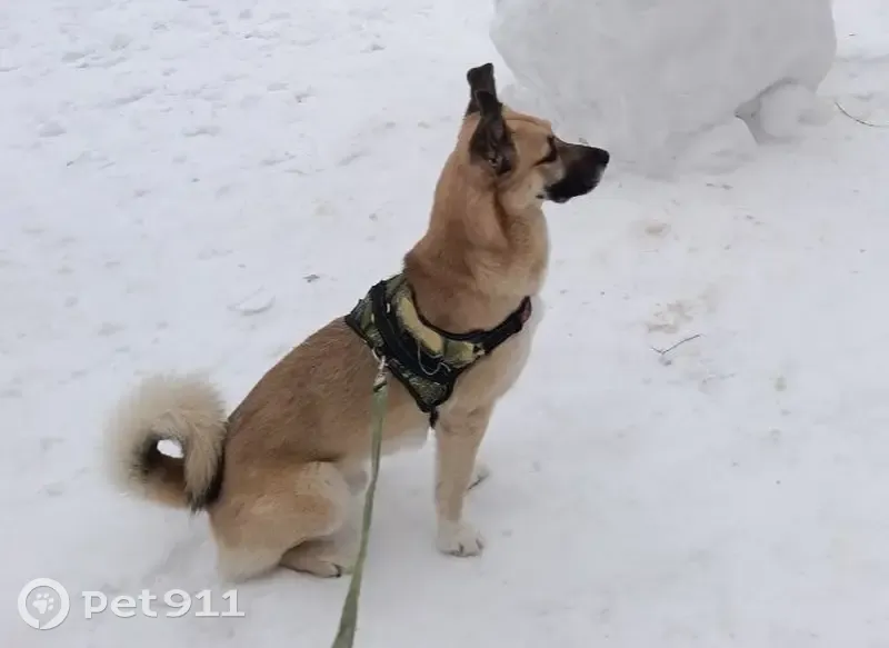 Средний рост, похож на овчарку, хвост как у лайки "калачом", одно ухо наполовину висит, окрас грязно-рыжий, мордочка черная. Был в черной шлейке, сорвался за собаками. Очень любит детей, не подходит к мужчинам.