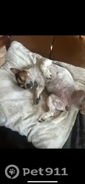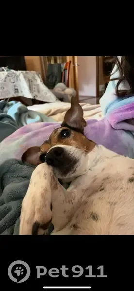 белая с черными и рыжими пятнышками, есть клеймо на животике. Очень ласковая , любит людей, привязана к дому, редко бывала на улице. Во время прогулки сорвалась с поводка и потерялась.