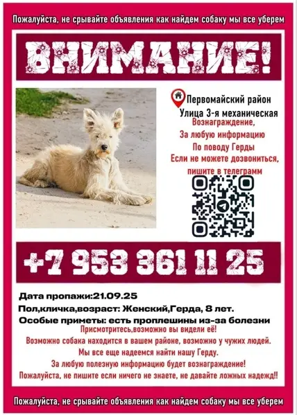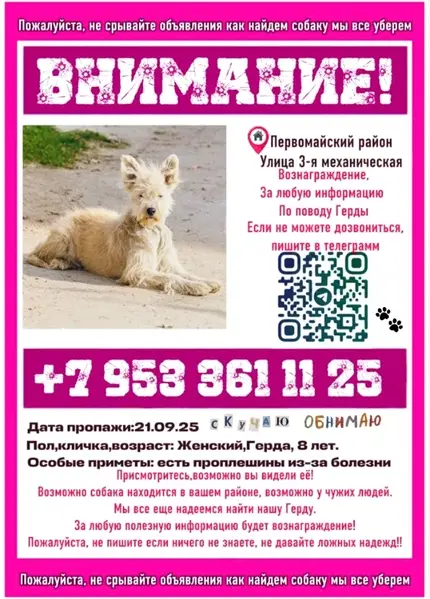ул. 3-я Механическая, Первомайский район ПРОПАЛА СОБАКА,ВСЕ ЕЩЕ НАДЕЕМСЯ НА КАКУЮ-ЛИБО ИНФОРМАЦИЮ Герда, добрая и игривая собака, не против пообщаться с другими песиками, совсем не агрессивная. Собачка болеет неизлечимой болезнью, является не заразной для других. В момент пропажи к сожалению была без ошейника. Она не приспособлена к морозу, т. К подшестка у неё толком нету. За все дни поисков ни одного звонка по поводу неё, мы объездили почти всю Первомайку, без толку, никто не видел нашу девочку. Переживаю что с ней что-то могло случится.. Вознаграждение за любую информацию гарантировано! С нетерпением ждем возвращения нашей Герды домой. Пожалуйста, помогите нам найти ее
