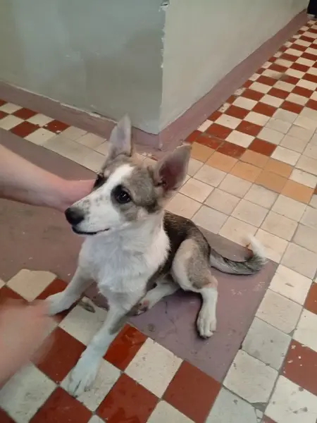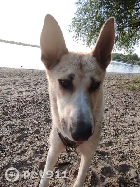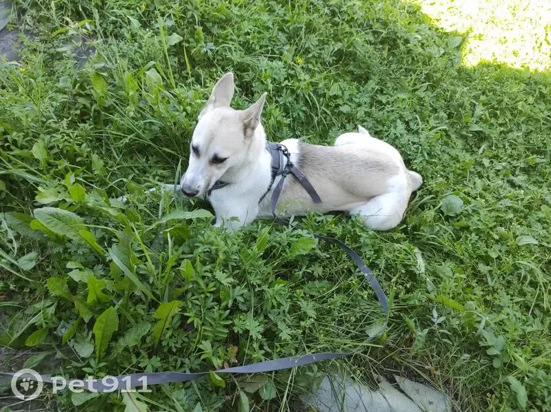 Светлая короткошёрстная собачка, высокие мощные лапки, очень добрая, игривая и недоверчивая, с опаской смотрит на всё новое, несмелая, очень любит играть с игрушками мягкими и звучащими, на собачке грязно зелёного цвета ошейник прочный тканевый. Вышла за ворота двора впервые, видимо по сугробу прямо через ворота или забор. Любопытная собачка, любит трепать всякие тряпочки, одеяла, что то мягкое.