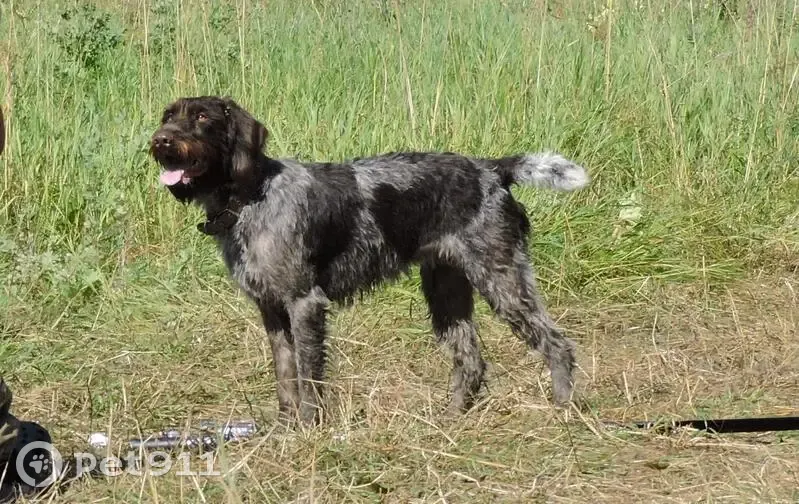 Собака породы Немецкий Дратхаар, пегая с темно-коричневыми пятнами, на левом боку пятно в виде сердечка, хвост купированный кончик хвоста белый, 9 лет, у собаки течка.