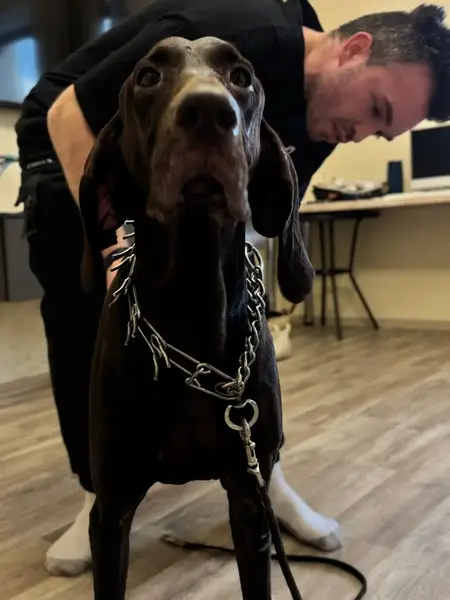 Черный кабель с белой грудью, уши и хвост купированы. Был в ошейнике зелёного цвета.