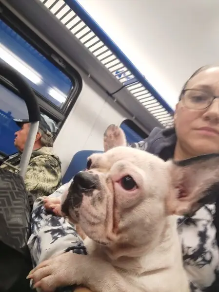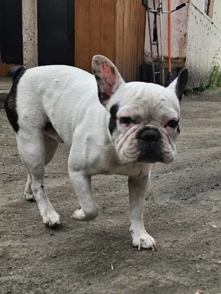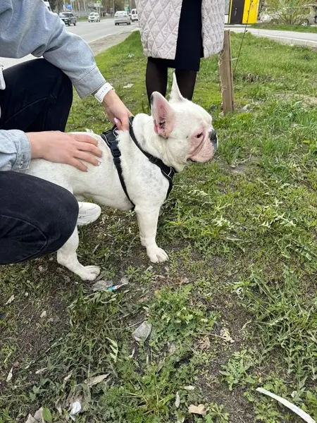 Один глаз голубой, второй наполовину коричневый, наполовину голубой. Шрам на животике от стерилизации. Черная шлейка