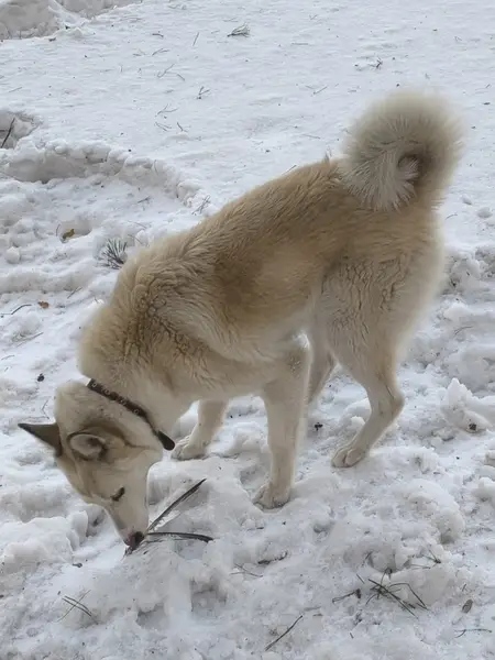 Взрослый кобель палево-белого окраса западно-сибирской лайки, кличка Бай, вывернулся на прогулке из ошейника.