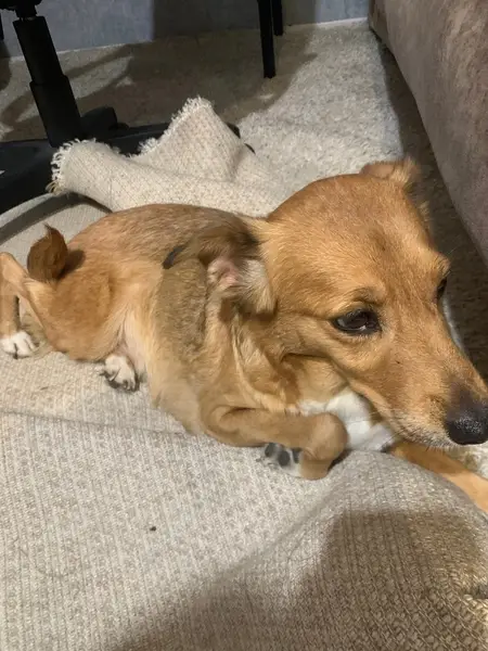 Девочка корге смешанная с дворнягой .очень пугливая страшно боится людей .взрывов хлопков .не когда не щенилась .не когда в жизни не носила ошейник и поводок 15 лет .зовут (Тося .)окрас черно рыжая ..храмает на заданию лапку ..очень упитанная .