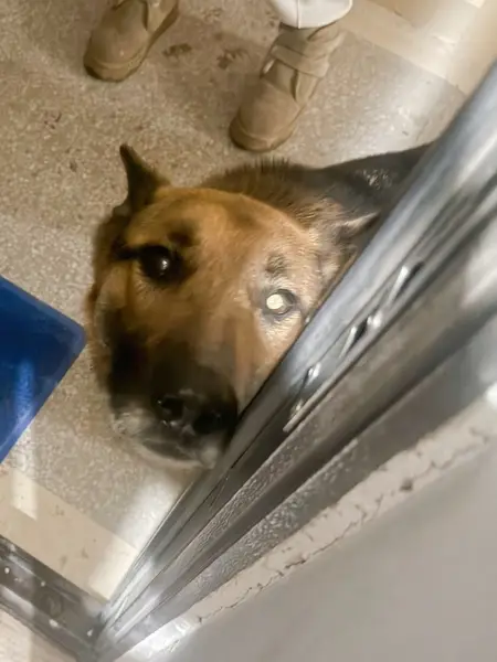 Собака рыжая, белое пятно на груди, мордочка тёмная. Кличка Найда, собака не огресивная. 3.04. Вечером убежала со двора без ошейника.