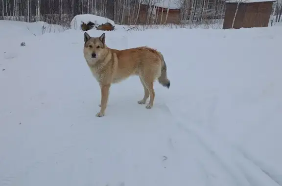 Красный ошейник, на ошейнике адресник. Собака ласковая, не кусается. Бежевого цвета собака. Крупная, стерилизованная.