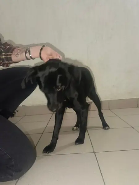 Черная, ноги в крапинку как у далматинца , с биркой в ухе , очень ласковая и тихая