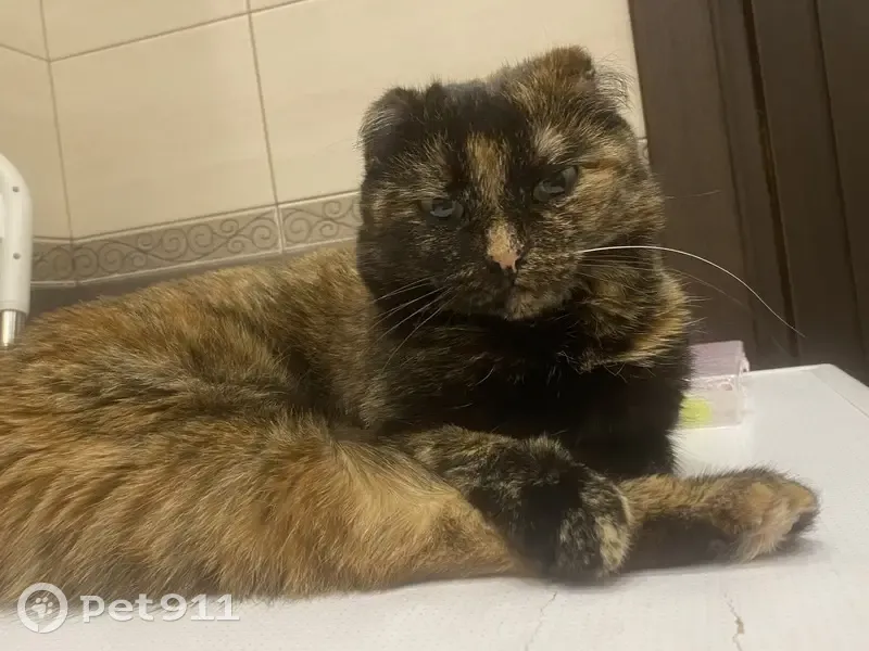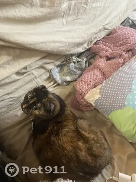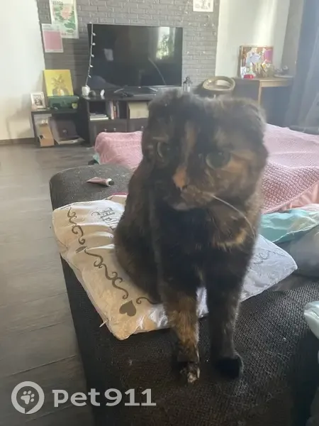 Окрас черепаховый (многоцветный, черно- коричневый с бежевыми пятнышками), круглые зеленые глаза Нет задней левой лапки, хвостик короткий, как у зайчика и ушки круглые