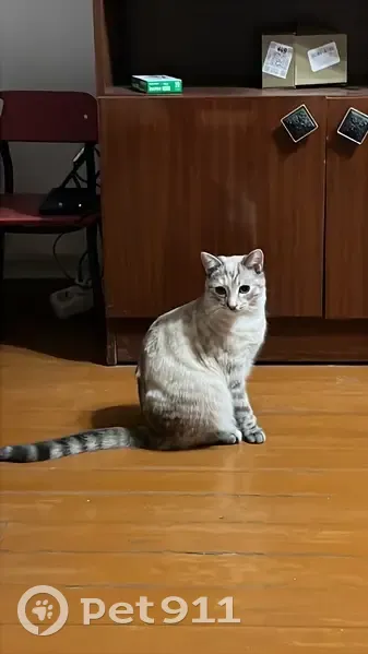 Возраст 1 год, кошка средних размеров, окрас серый, на носу жёлтое пятнышко. Откликается на имя Буся, громко мяукае. В день пропажи был одет ошейник от блох, черный. Кошка стерилизована.