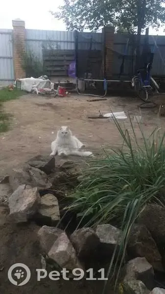 Белый пушистый (длинношёрстый) кот с голубыми глазами. Довольно крупный. В СНТ Пчелка ул. Пчеловодная, был впервые. Испугался и ушёл в направлении сторожа...
