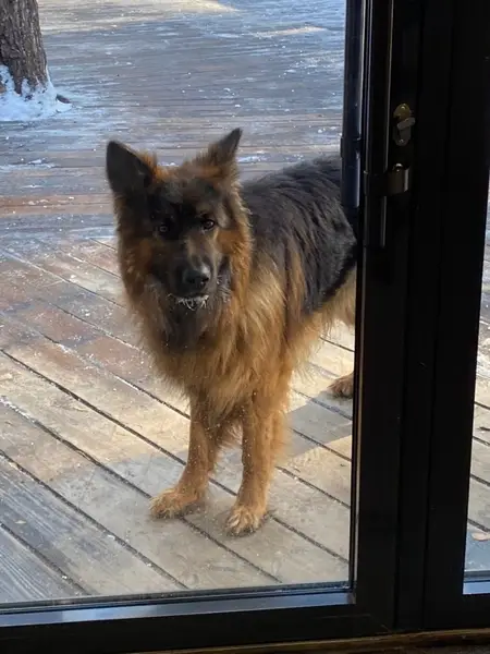 Немецкая овчарка, длинношерстная, девочка , открылась калитка она выбежала .