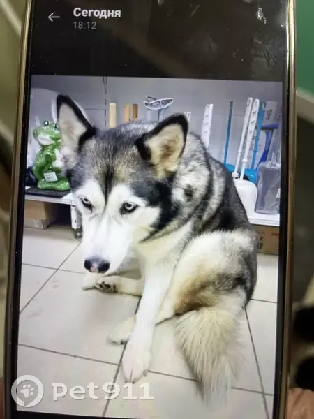Хаски, спокойный(грустный), с металлическим ошейником цепочки вроде в три ряда. Пока находится в магазине Строй товаров, дальше не знаем куда его можно определить. Фото попробую переснять