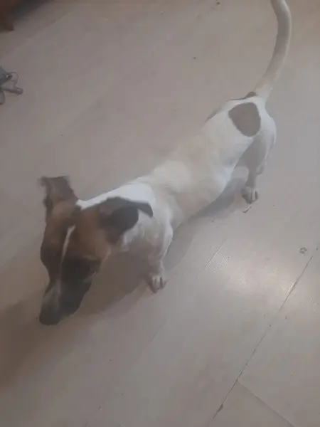 Джек Рассел девочка по кличке Джесси. Сама белая, а морда рыже коричневая. Есть чип.