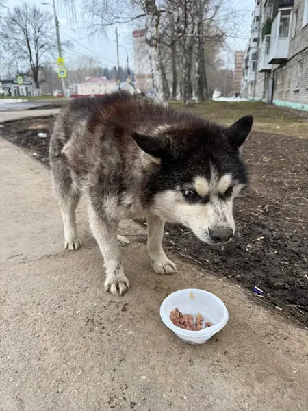 Темно серый,почти черный цвет с белыми пятнами, глаза разные - один голубой, другой коричневый. Возраст 6 лет. Очень добрый. Потерялся без ошейника и поводка.