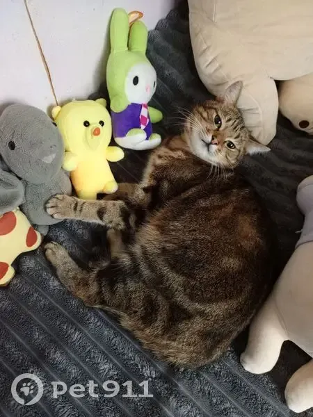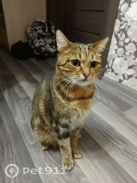 На шее было 2 ошейника: один обычный жёлтый, второй (временный) против блох (бежево-коричневого цвета). Очень боится чужих людей, т. К. Котик домашний.