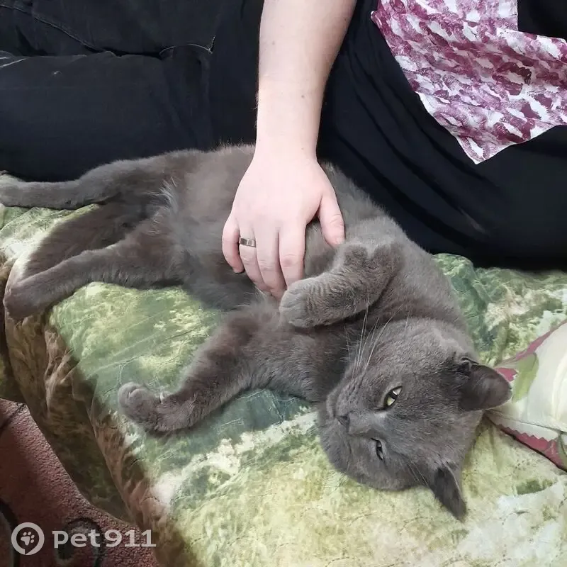 Серый большой и толстый кот, 4 года. Откликается на кличку Афоня, дружелюбный и может пойти на контакт. Глаза желто-зеленые.