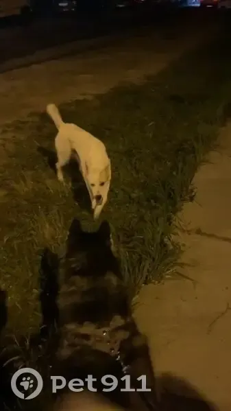 Белая гладкая шерсть, темно-коричневый ошейник, темно-карие глаза, длинный хвост, высокий, очень худой, видно ребра и мышцы, дружелюбен к другим собакам, подходит понюхать, но боится и быстро убегает, не задерживается, будто кого-то или что-то ищет. В этом районе появляется уже второй раз за три дня.