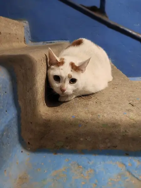 полностью белый котик с черным хвостиком, черное пятнышко на правом ушке и маленькое пятнышко на левом ушке