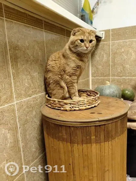 Рыжий кот, вислоухий, смешанной породы, некастрированный. Возраст- 4 года. Выскочил из поводка при первом его выгуле на улице. Боится улицы.