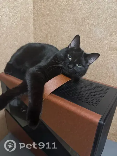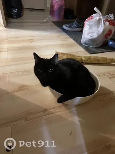 Черный котик, с белым пятнышком на шее под подбородком. Пропал при переезде. Очень пугливый, скорее всего прячется где-то по углам.