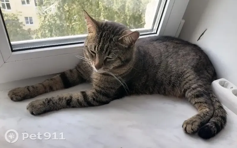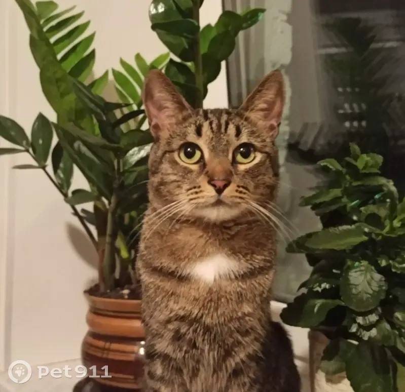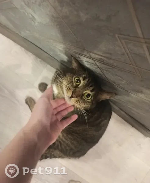 Котик средних размеров, полосатый окрас, глаза зеленые, иногда с переливом становятся янтарные, пуглив, на руки к незнакомым не подойдëт, на имя может не откликнуться