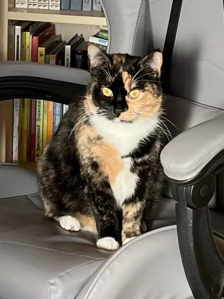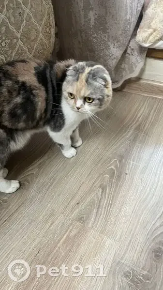 Окрас разноцветный: рыжий. Черный. Белый. Кошка- вислоухая шотландка, приятная. Спокойная. Добрая. Ухоженная.